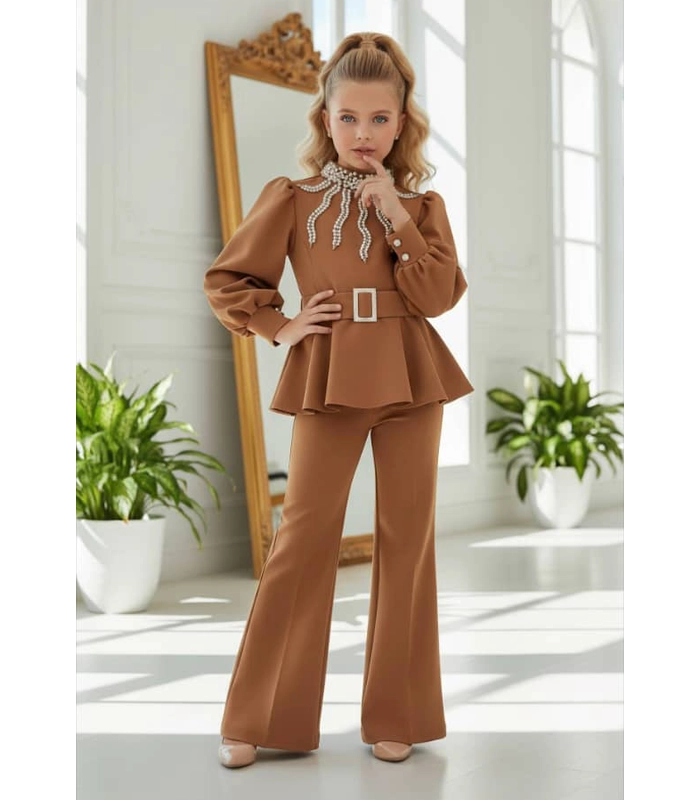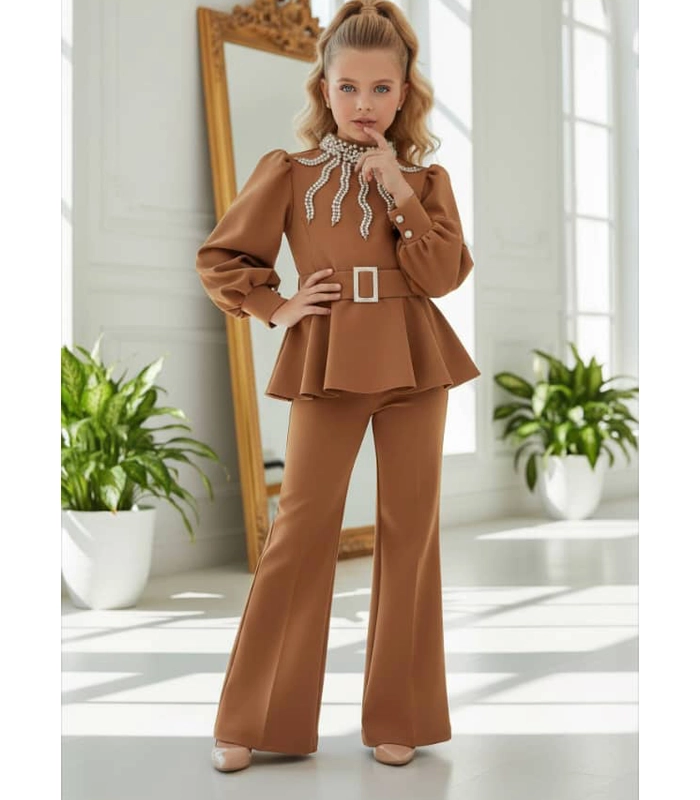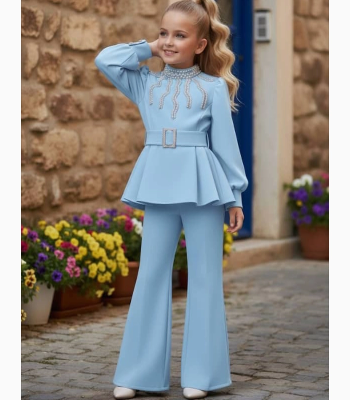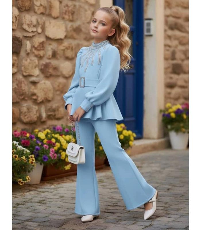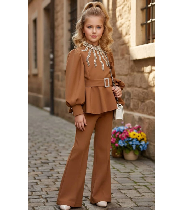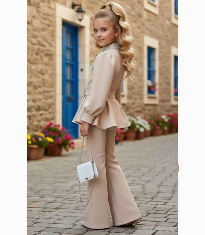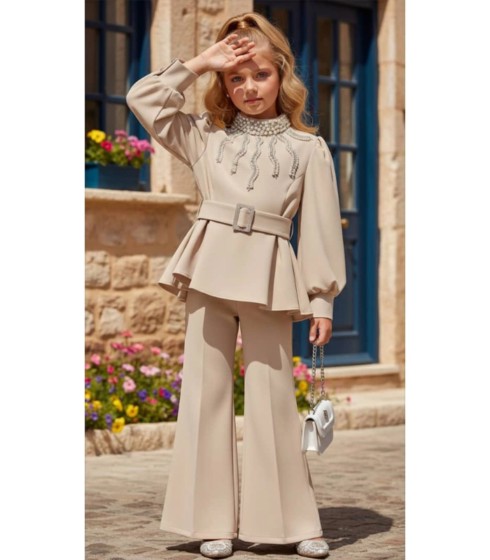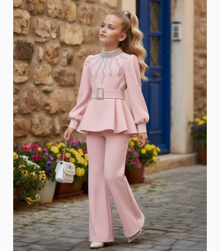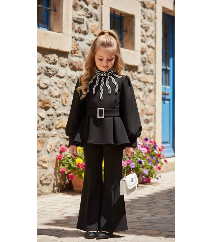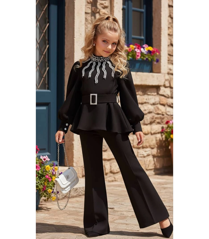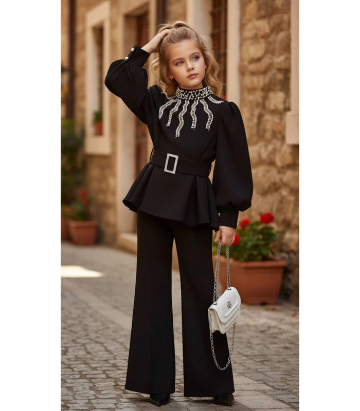بلوزة مبطنة ومزينة باللؤلؤ -حزام – حقيبة